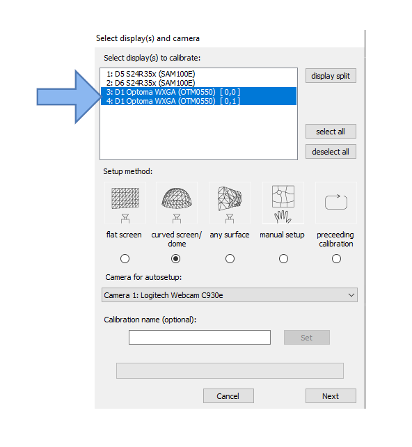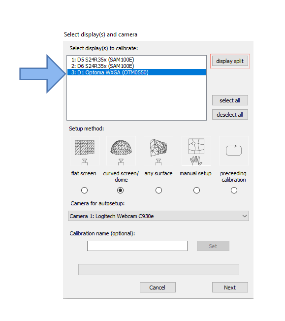 For the calibration process, it is necessary that your system views separate displays. To accomplish this, press the ‘Display split’ button on the select display(s) and camera window.