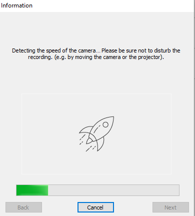 The projectors and camera must not be moved while calibration is in progress (indicated by the output of moving test patterns from the projector). In addition, the measurement process must not be interrupted by external influences (e.g. changes in ambient light, people between the projector and projection surface).
