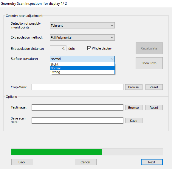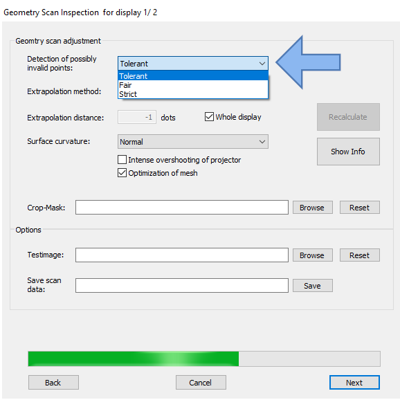 => In such a case, increase the extrapolation distance incrementally until a sufficient coverage of the projector is achieved. Setting the mark on “whole” display will extrapolate all projector pixels – required if projectors do not have any overshooting.
