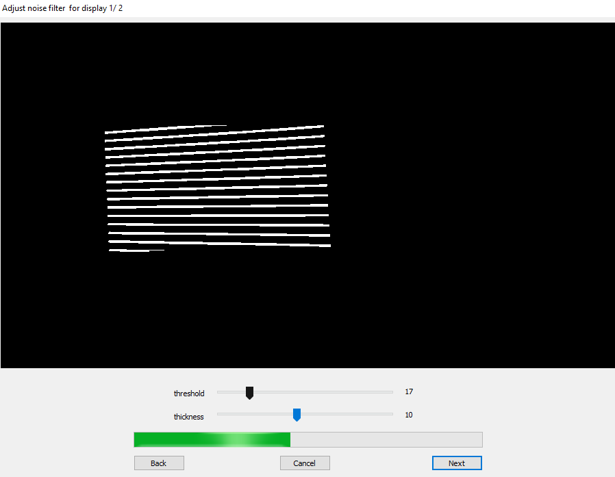 - Threshold- Glide the nob on the threshold slide bar to adjust noise levels. The aim is to have as little noise as possible. Set the threshold level so that all lines are easily visible at the edges and in the corners of the test image (striped pattern). However, be sure to avoid visible interference (noise)!