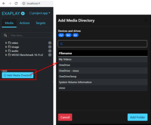 2. Select a target: this is the place on the screen(s), where EXAPLAY outputs the playback. Targets can be entire displays (“system target”), parts of displays (“custom targets”) or calibration files from VIOSO 6 software (*.vwf). “DISPLAY1” will create a fullscreen output on that screen. “Primary 16:9 FullHD (1920×1080)” will draw a rectangle of this size on the primary display and output there.