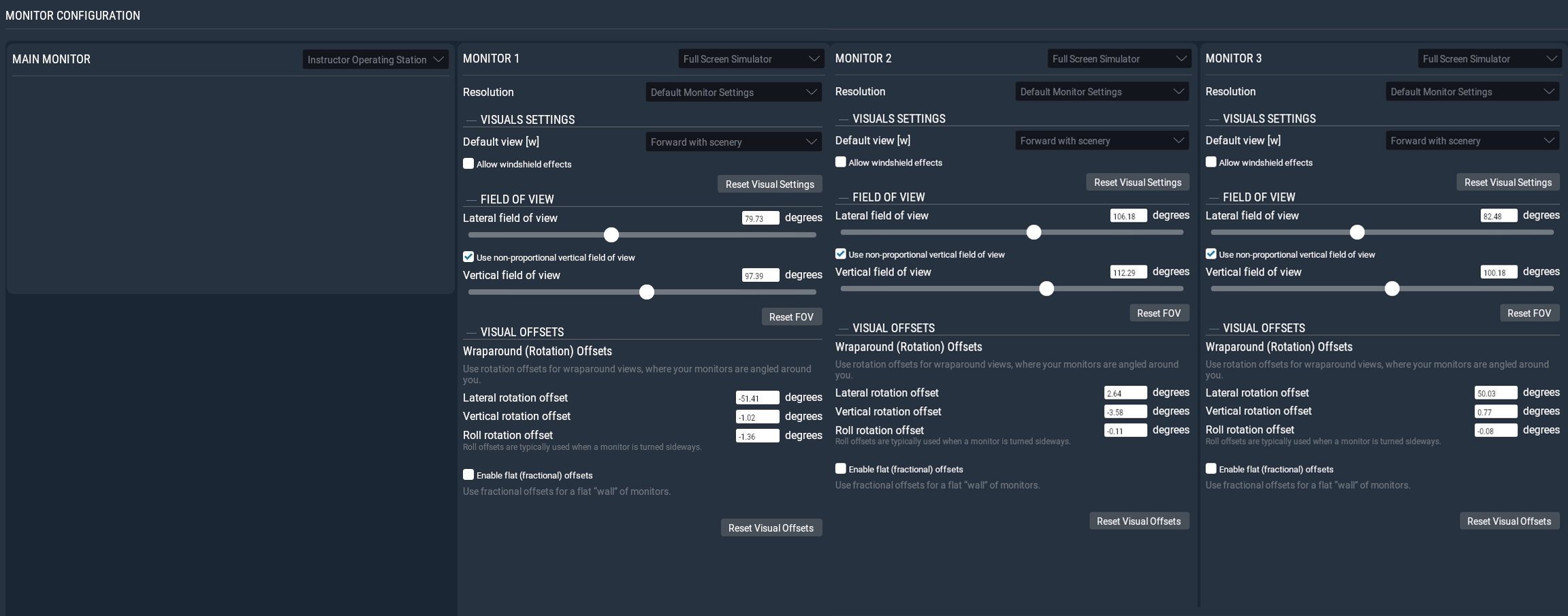 [default] logLevel=2 bLogClear=1 ;clear log file on start ; use with right-handed (most openGL/Vulcan) coordinate system using x-right, y-up, z-rearward, scaling Meter (host) to Millimeter (mapping) trans=[1000,0,0,0; 0,1000,0,0; 0,0,1000,0; 0,0,0,1] near=0.1 ; the minimum rendering distance, all faces closer than that are culled far=20000 ; the maximum rendering disctance, all faces futher than that are culled bTurnWithView=1 ; set to true, if moving platform alas world turns with view direction bUseGL110=1 ; enable to use with fixed-pipeline openGL bicubic=0 ; set to true to enhance sampling acuracy, will use up some extra GPU mouseMode=0 autoViewC=1 ;if viewplane is skewed, widen FoV to cover a moving range of autoViewC * screen bAutoView=1 ;overwrites screen fov and dir calibFile=C:\Users\Public\Documents\VIOSO\Anyblend\Export\xplane.vwf ;enable next to simulate head-tracking input, if your application does not provide this ;make sure to call VWB_getView.. each frame in pre-render stage and use the received parameters to render your scene ;eyePointProvider=EyePointProvider eyePointProviderParam=listen 1998 [Monitor0] ; will not be warped as this is the instructor monitor, we put in a blank calibFile calibFile= [Monitor1] calibIndex=0 ;left [Monitor2] calibIndex=1 ;center [Monitor3] calibIndex=2 ;right