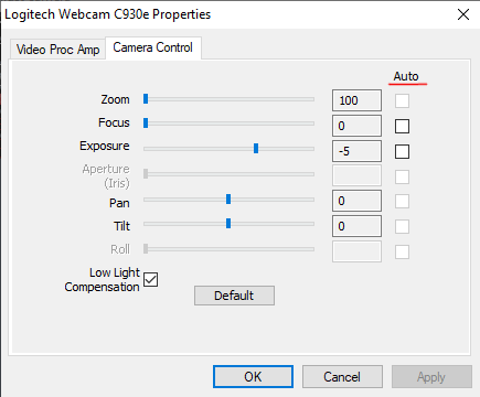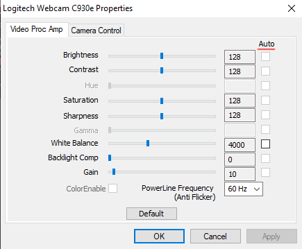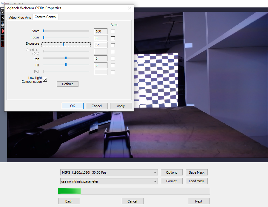 If you would like to improve the quality of the picture on screen, click on the ‘Options’ button. A dialog with the settings of your camera will appear. You can modify the settings there until the image on screen is acceptable and as close to reality as possible. Try to change the parameters for exposure, brightness, etc.
