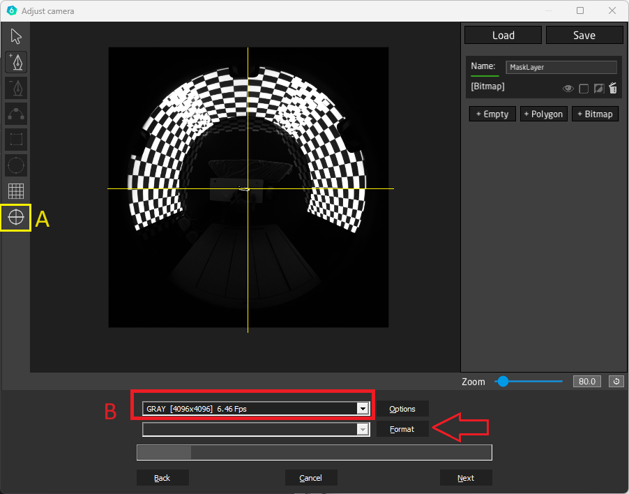 - Double-check that the camera is set to the custom 1:1 resolution (B)