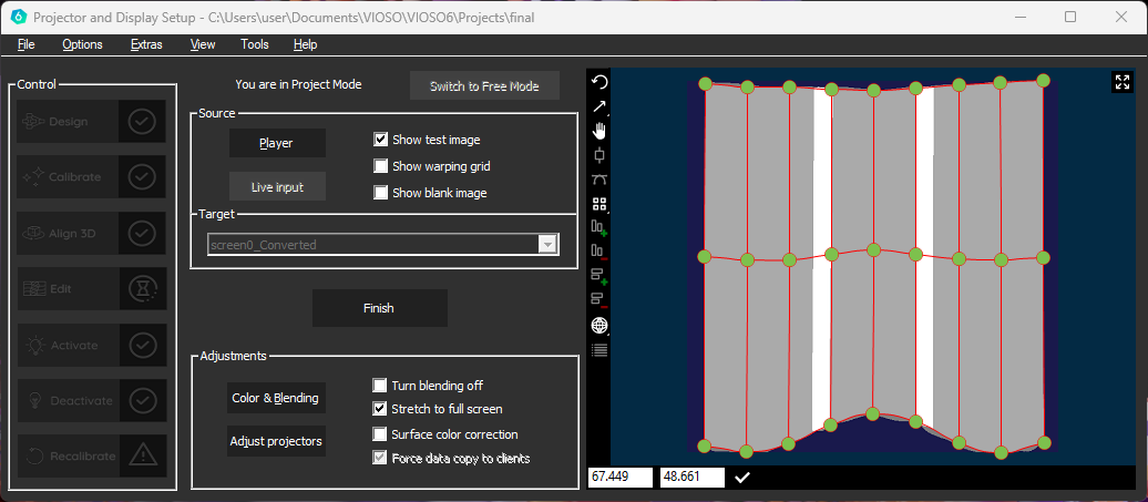Click “Player” and add the testpattern generated in step 2.2 (Preparation) and click Play to display it on the projectors. It will fit to the screen according to the way the 3D alignment has been done before.