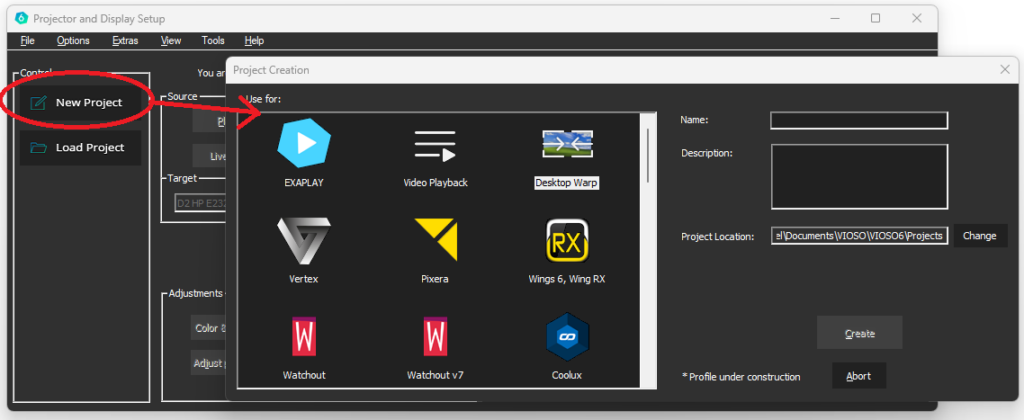 Launch VIOSO 6 and run in Project Mode. Create a new project according to the designated playback solution. We will use Windows Desktop Warp as an example for this tutorial.